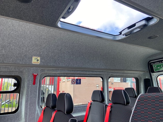 Emergency exits through roof glass and side window, complete with glass break hammers